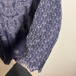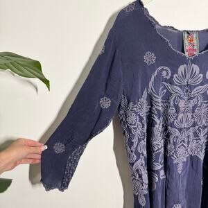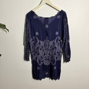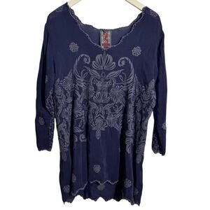 Johnny Was Top Women S Blue Navy Embroidery Tunic 3/4 Sleeve Boho Hand Stitch