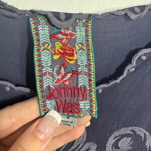 Johnny Was Top Women S Blue Navy Embroidery Tunic 3/4 Sleeve Boho Hand Stitched