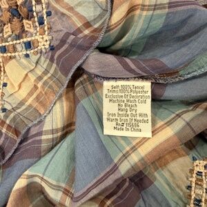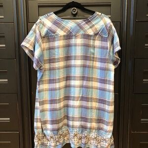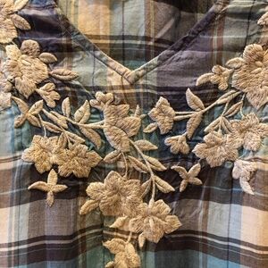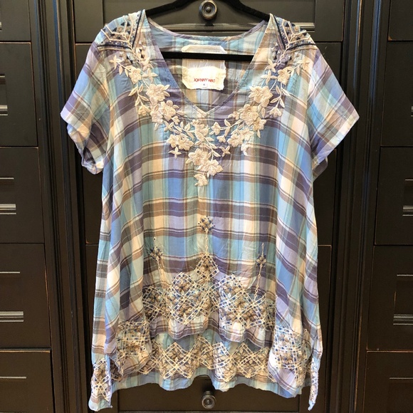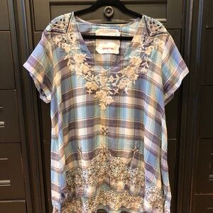 This is a lovely blue, purple, lavender, teal, tan, cream, and brownish tunic by Johnny Was 3J Workshop. The embroidery is spectacular! This top measures 25" from shoulder to bottom front and 30" from top of shoulder to bottom back. The sleeves are 6.5" long and the top is about 24" from side to side.