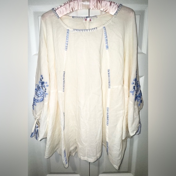 Beautifully crafted in signature Johnny Was style, this Uma Tunic blends bohemian charm with timeless sophistication. Made from 100% soft, breathable cotton, it features stunning sky-blue floral embroidery on the sleeves, intricate whipstitch detailing along the neckline and seams, and tassel-tie cuffs for that effortless artisan touch.