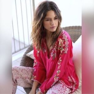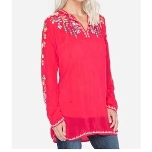 Johnny Was Vanessa floral embroidered tunic blouse in Pink Berry. Please note, this hue looks more red than pink in some lighting. Size S, in excellent condition. Retail $225, sold out style.