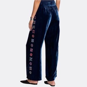 Johnny Was Velvet Wide Leg Pants Embroidered Blue Silk Blend NEW