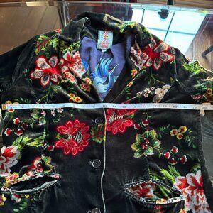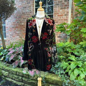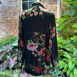 Johnny Was Vivian Black Floral Blazer Mini Dress. Women's size small. Black velvet rayon with rich multicolor floral pattern and floral silk lining. Button front. Front pockets. Can be worn as a blazer or mini dress. Excellent condition. No visible flaws. Smoke-free home.