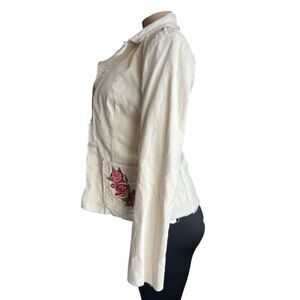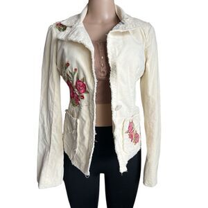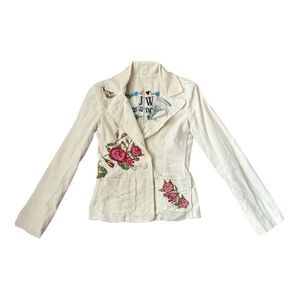 Stylish white blazer with vibrant floral embroidery. Features a classic collar and front pockets. Perfect for adding a touch of elegance to any outfit.