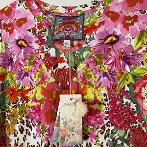 The Johnny Was Wild Garden Puff Sleeve Knit Tee, size S, is a beautiful top. Like all of the Johnny Was items I am selling, this top will seriously look great on any body type. The bamboo cotton feels amazingly soft on, and the material drapes over your torso and mid-section in a really lovely way. The pattern of multi-colored leopard print with flowers is unusual in a shirt, as are the sleeves, which have just the tiniest little puff at the top--enough to create interest, but not so much as to make your shoulders look weird. It's perfect for Spring or Summer. This item/pattern is no longer being made by Johnny Was.