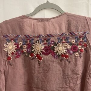 Pink green and blue embroidered flowers around the neck sleeves and hem