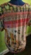Johnny Was "Angelica Stripe" top made from 95% bamboo and 5% spandex. It features a v-neck and short sleeves with a colorful, abstract floral print that includes elements of a cityscape. The design has horizontal stripes at the bottom. The top is lightweight, soft, and breathable due to the bamboo fabric.