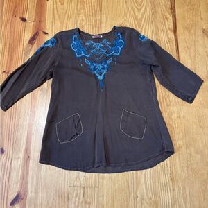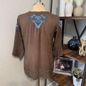 This is a Johnny Was women's blouse in size small, featuring a brown color with turquoise embroidery. Made of cupra rayon, it has a V-neckline, 3/4 sleeves, a pullover closure, and a relaxed fit. The bohemian-themed tunic is lightweight and suitable for travel or casual wear in the summer, fall, or spring.