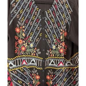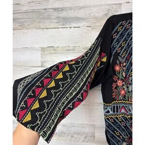 Johnny Was womens M Ezra blouse black embroidered floral top boho button up cinch waist rayon blend designer boutique bohemian clothing Johnny Was embroidered shirt women’s size medium chic colorful stitching luxe boho fashion artisan style relaxed fit casual dressy top premium quality feminine embroidered blouse