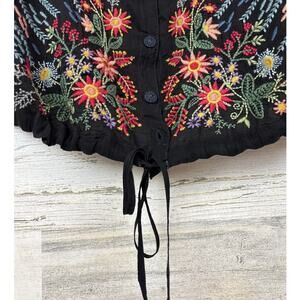 Boho and beautifully detailed, this Johnny Was Ezra blouse features intricate multicolor floral embroidery on soft black fabric with a relaxed button-up design. The adjustable cinch waist creates a flattering, customizable fit, perfect for pairing with jeans, skirts, or layered boho looks.