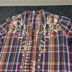 Johnny Was Womens Rosalva Paris Effortless Blouse Plaid Top Tunic Embroidered