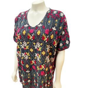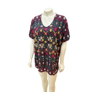 A versatile blouse that works from desk to dinner!Elevate your wardrobe with the Women's Sibyll Blouse by Johnny Was, a masterpiece of subtle, classic custom embroidery in vibrant primary colors. This blouse features short sleeves and a stylish criss-cross ribbon design down the middle, creating an eye-catching yet delicate look. Made in China from 100% Cupra Rayon, this patterned piece boasts a flattering crewneck and a fit that flares out at the waist. Closure - Pull-on. Care - Dry clean suggested.