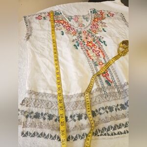 Elegant white tunic top with colorful embroidery. Perfect for a casual day out or a relaxed evening. Lightweight and comfortable.