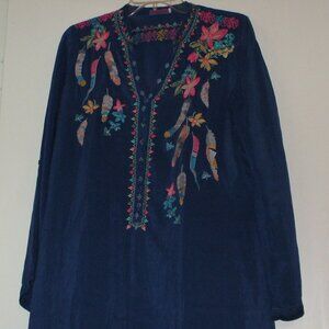 Gorgeous navy blue tunic top with embroidered flowers. Size ranges from small to medium as I wore this top. Made of cupra rayon and polyester thread for embroidered flowers.