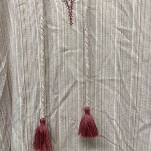 Split neckline with tassel ties. Banded collar with embroidered trim. Long sleeves with elasticized ends.