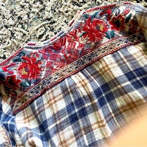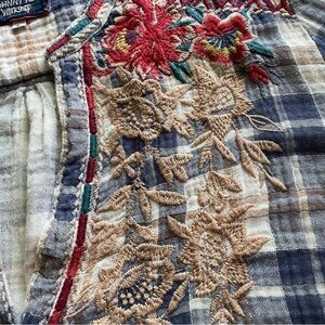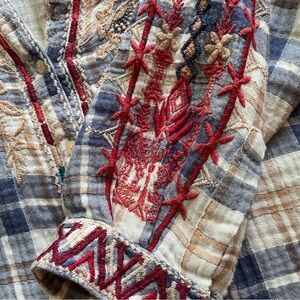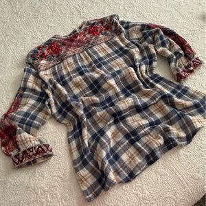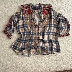 Johnny Was workshop Stylish plaid top with intricate embroidery. Features a blend of blue, red, and cream colors. Perfect for casual outings.