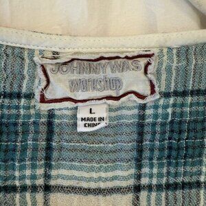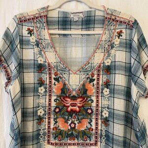 Johnny Was Workshop Julienne Drape Embroidered Plaid Tunic Blouse - Size Large in excellent preowned condition! Beautiful shirt. See photos for measurements.