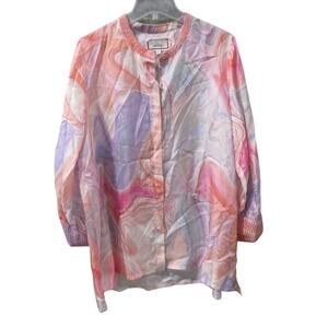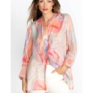 Elevated bohemian meets resort-ready luxe 🌺 This Johnny Was Workshop Laguna Vesper Voyager tunic is crafted from 100% silk with a flowing, relaxed silhouette. Featuring a button front, long sleeves, and a painterly marbled swirl print in pink, coral, lilac, and soft neutrals.