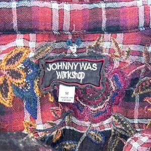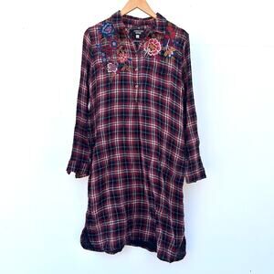 Johnny Was Workshop Plaid Long Sleeve Flower Embroidered Tunic Dress Medium Red