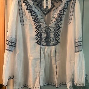Johnny Was Workshop Simone Embroidered White Blue Flare Sleeve Blouse