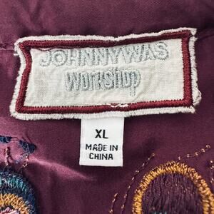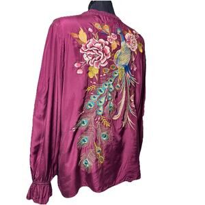 Johnny Was Workshop XL Purple Silk Peacock Quito Blouse Embroidery Button V Neck
