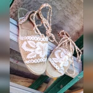 Johnny Was X Antik Batik Tori Sandals Espadrilles Size 6 EU Size 36 New without box MSRP $200 The thick heel and upper strap will have you wearing these sandals every day this season. Made from braided jute and raffia laces these Tori Sandals are a must-have for your bohemian collection. Floral details and a subdued color palette make these sandals understated yet irresistibly chic. Braided jute and raffia Heel strap Floral details Care Instructions: Spot clean with damp cloth