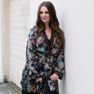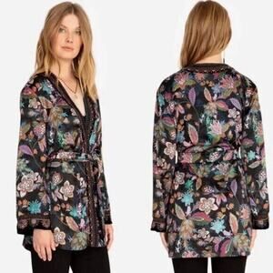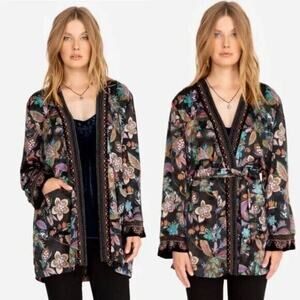 Johnny Was XL Leopard Print Silk Lined Kimono Duster Wrap Velvet Trim Pockets NWOT