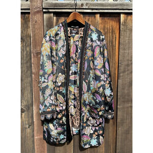 Johnny Was XL Leopard Print Silk Lined Kimono Duster Wrap Velvet Trim Pockets