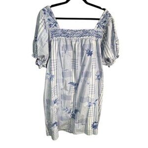 Johnny Was dress, blue plaid dress, embroidered dress, square neck dress, XL dress, women's clothing, casual dress, cotton dress, puff sleeve dress, summer dress, blue dress, floral pattern, new with tags