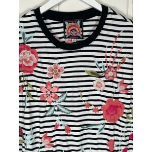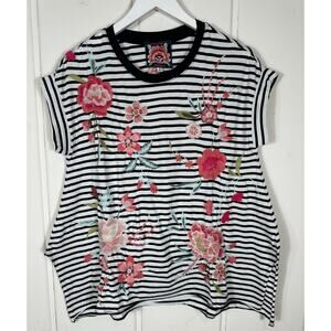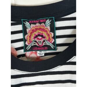 Keywords: Johnny Was, T-shirt, Floral, Embroidered, Striped, Crew Neck, Short Sleeve, Bohemian, Casual, XL, Plus Size, Black and White, Floral Top