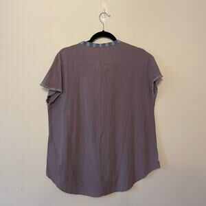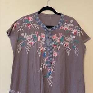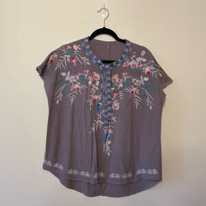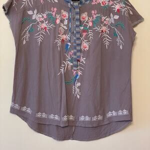 Johnny Was XXL gray blue bohemian short sleeve blouse floral embroidered boho