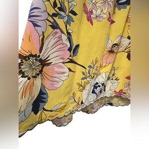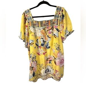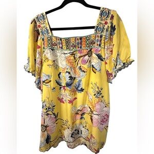 Vibrant yellow silk blouse with floral design. Features multicolor embroidered neckline. Short sleeves with ruffle detail. Runs large, fits more like an XL.