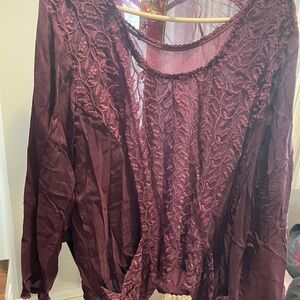 Exquisite Johnny Was Burgundy Embroidered Blouse. This beautiful blouse from Johnny Was features a rich burgundy color with intricate tonal embroidery across the front and shoulders, creating a delicate and artistic pattern. It has a relaxed, flowing silhouette, a scoop neckline, and long sleeves. The fabric appears to be lightweight and possibly sheer, adding to its bohemian charm. Perfect for a unique and elegant statement!