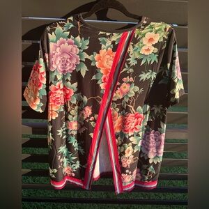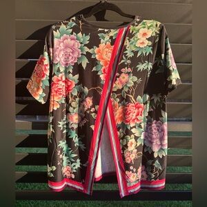 Elegant women's top featuring a vibrant floral design on a black background. Perfect for adding a touch of color to your wardrobe.