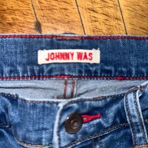 Johnny Was distressed, broken in, luxe, classic, ankle jeans. Pairs well with a blouse or basic tee and ankle boots. Approximately 14 inches across the waist, 8 inch rise, and 28 inch inseam. In good, used condition. From a pet and smoke free house.