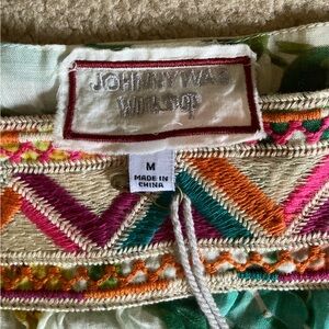 NWT Johnny Was boho peasant square neck top. Bright embroidery with zigzag patterns. Features pink, orange, and teal details. Signature Johnny Was style. Size women’s M