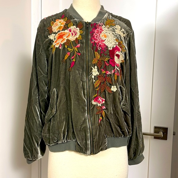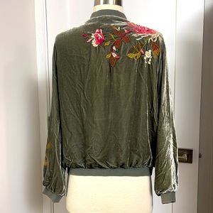 Vintage Johnny Was velvet jacket beautiful embroidered flowers 💐 n front and back of jacket. Unfortunately I notice stains in both sleeves closer to wrist, not that noticeable when wearing