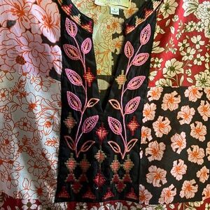 Multi colored patchwork, a lot of pink, orange, reds with beautifully embroidered collar. Airy, thin cotton. New but with no tags.
