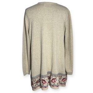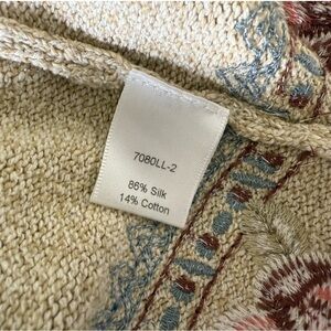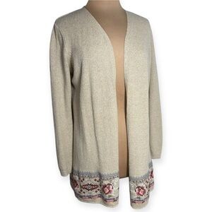 Johnny Was neutral beige open front cardigan with pink mauve floral embroidery