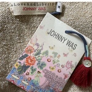 4 Love & Liberty by Johnny Was is known for its bohemian-inspired designs and use of embroidery. The cardigan features a simple, collarless design with sleeves and a straight hem. The embroidery at the bottom showcases a pattern of stylized flowers and geometric shapes in shades of red, pink, blue, and green.