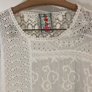 Johnny Was pure white top/tunic 3/4 sleeves, embroidery, eyelet, and open lace