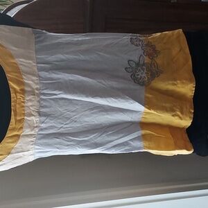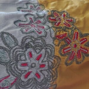 This Johnny Was is a silk and cotton blend with embroidered accents that this brand is known for. Very cute. Lightweight. Mustard and gray color