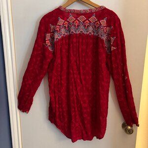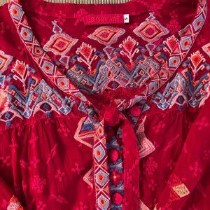This is a beautiful Johnny Was top in deep red with lovely embroidery across the front, shoulders and both sleeves. In addition to the embroidered flowers it is embroidered with red across the entire garment. It is a size S made of 100% polyester.