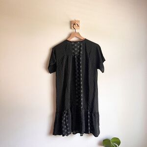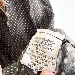 Johnny Was Biya Zoe Silk Dress in Dark Navy/Grey. Features polka dot print, embroidered details, flounce hem, short sleeve, lined, & made with 100% silk. In excellent condition. No holes, rips, or stains. Ours is a pet & smoke free home.