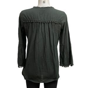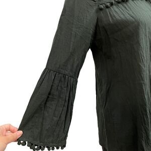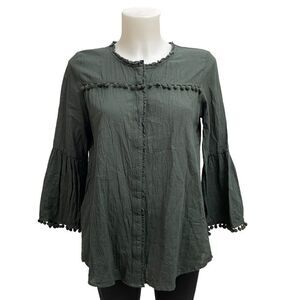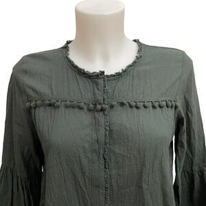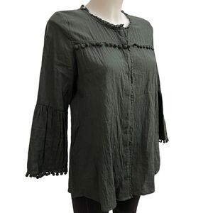 Johnny Was Calme Olive Green Bell Sleeve Fluted Pom Pom Boho Blouse Top Small