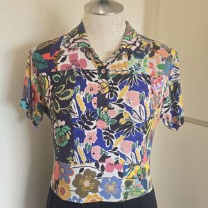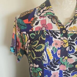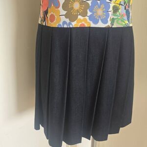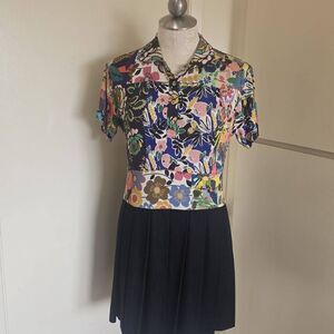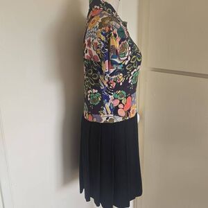 Jonny Was floral print and pleated denim sheath dress with 4 button front and collar. The bodice is a beautiful knit blend(rayon/spandex?) and the skirt is a crisp pleated black denim.