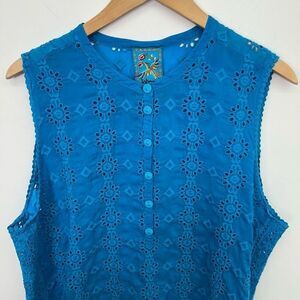 Johnny Was Women’s Blue Floral Symmetrical Boho Eyelet Sleeveless 1/4 Button Front Tunic Blouse