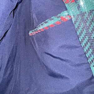 Stylish plaid blazer from Johnny Wujek. Features a mix of red, green colors with sequins. Perfect for a chic look. Snap front closure and an inside pocket. Front pockets are just for looks. Padded shoulders. New with 1 tag. Unfortunately the price tag is gone. Women’s size small.