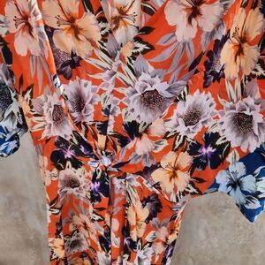 bright and colorful 100% rayon floral dress. ombre detail on kimono style sleeves. tie front detail. v neck. midi length