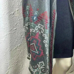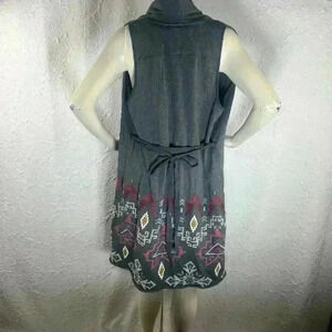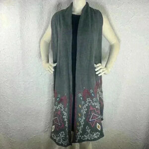 Johnny Was gray cotton knit vest with tribal-inspired cross-stich embroidery; raw edges